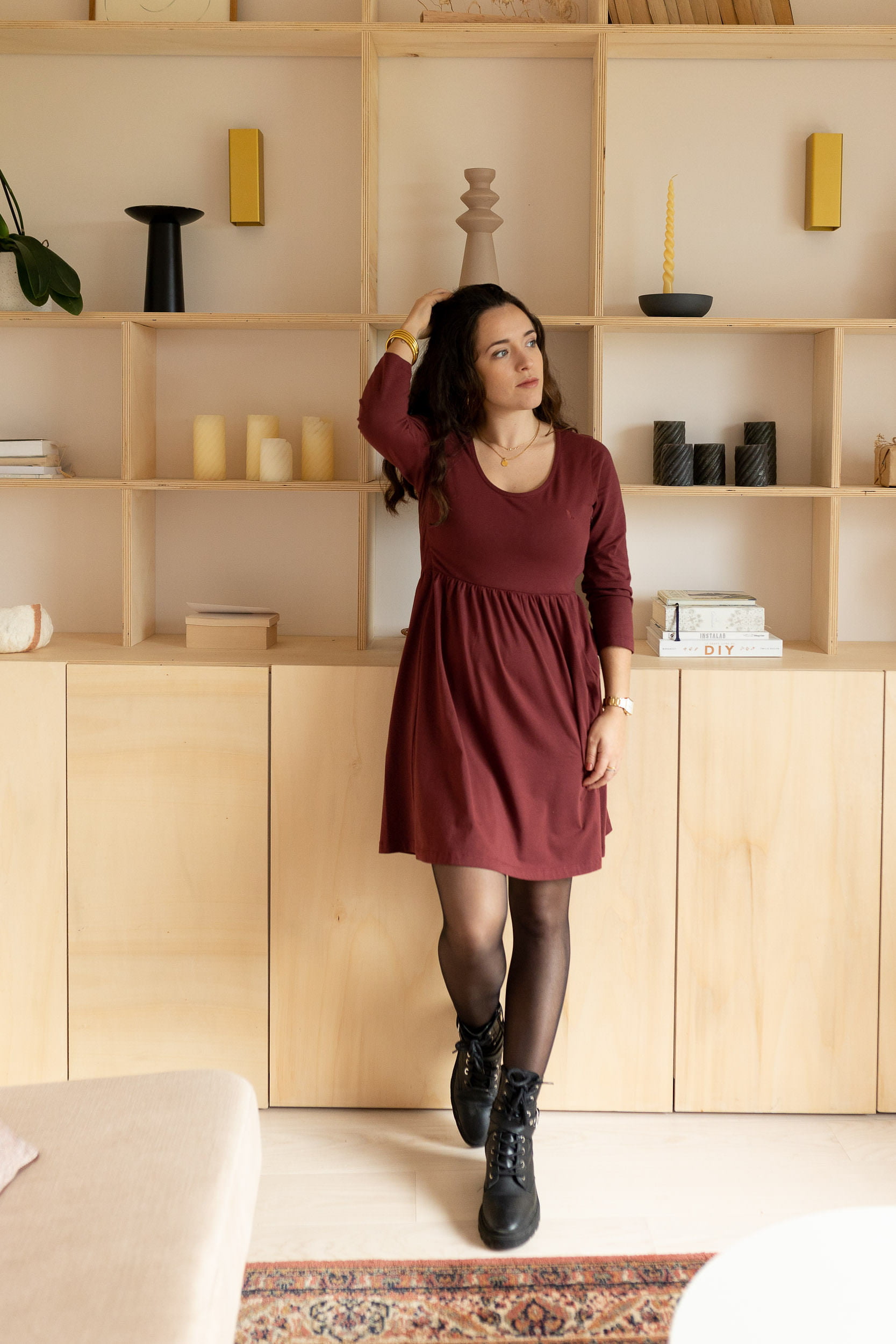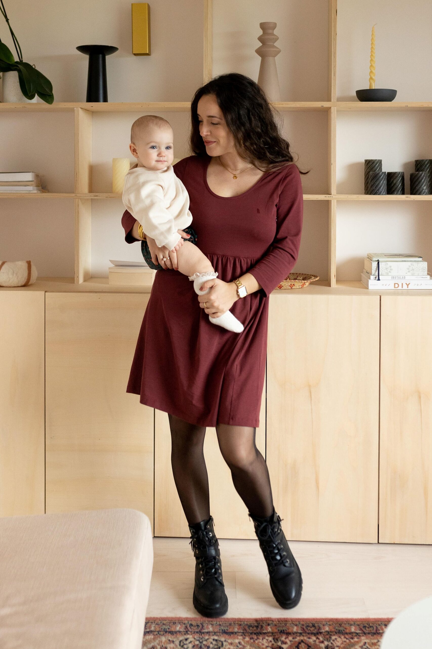 Amy ou la petite robe d’allaitement féminine et confortable qui vous suivra tout l’hiver. Une matière douce souple et confortable qui lui procure un tomber parfait, une jolie coupe cintrée à la taille, un col danseuse hyper féminin, des manches fittées qui dévoilent les poignets pour plus de féminité, elle aura tous les atouts pour vous convaincre! Ce vêtement allaitement sera parfait avec de jolis bijoux dorés, une belle ceinture et un petit cardi. En bordeaux ou en noire, cette robe saura forcément trouver une place dans votre garde-robe Le gros plus ? Avec ses zips invisibles vous la porterez…