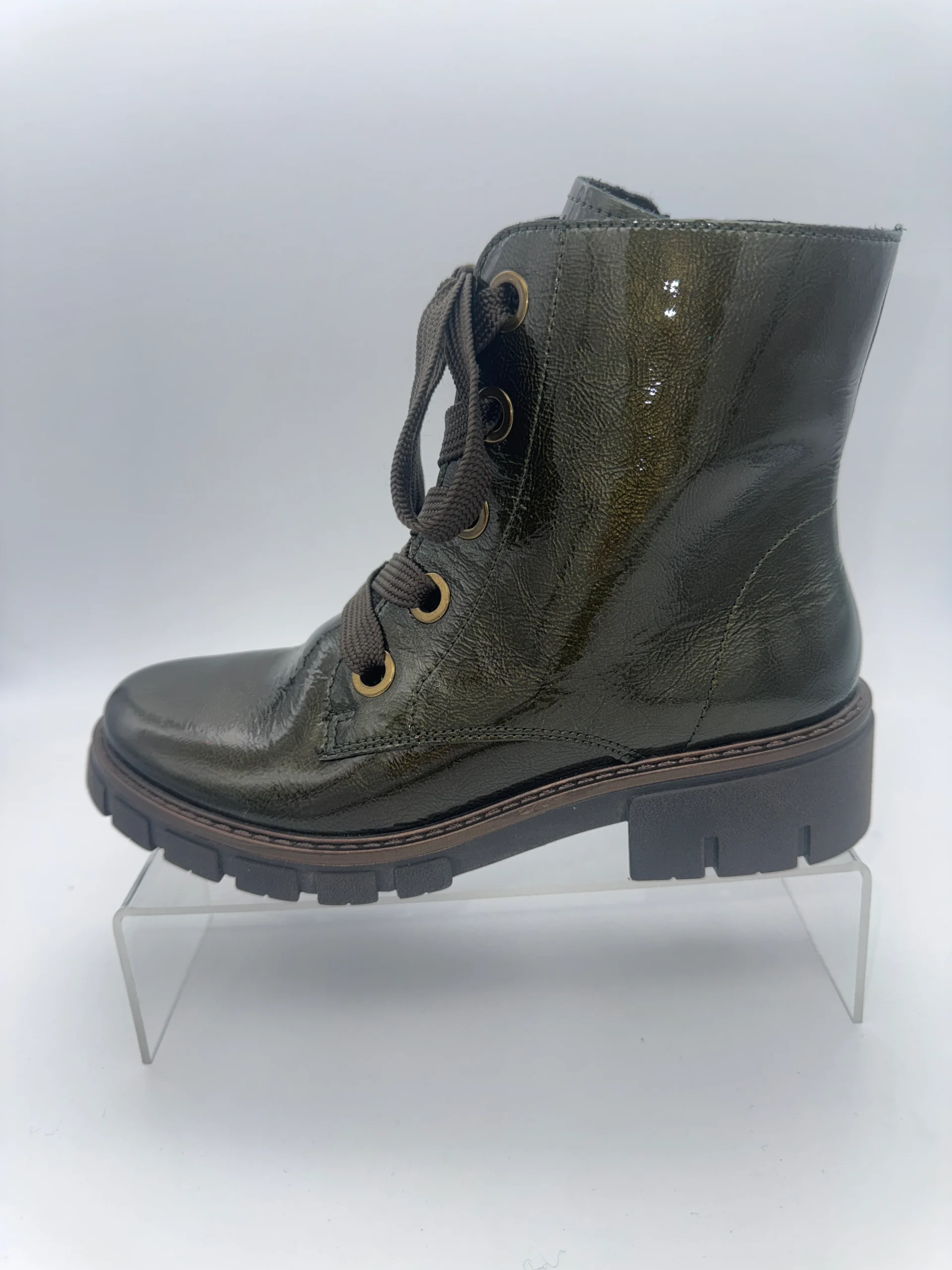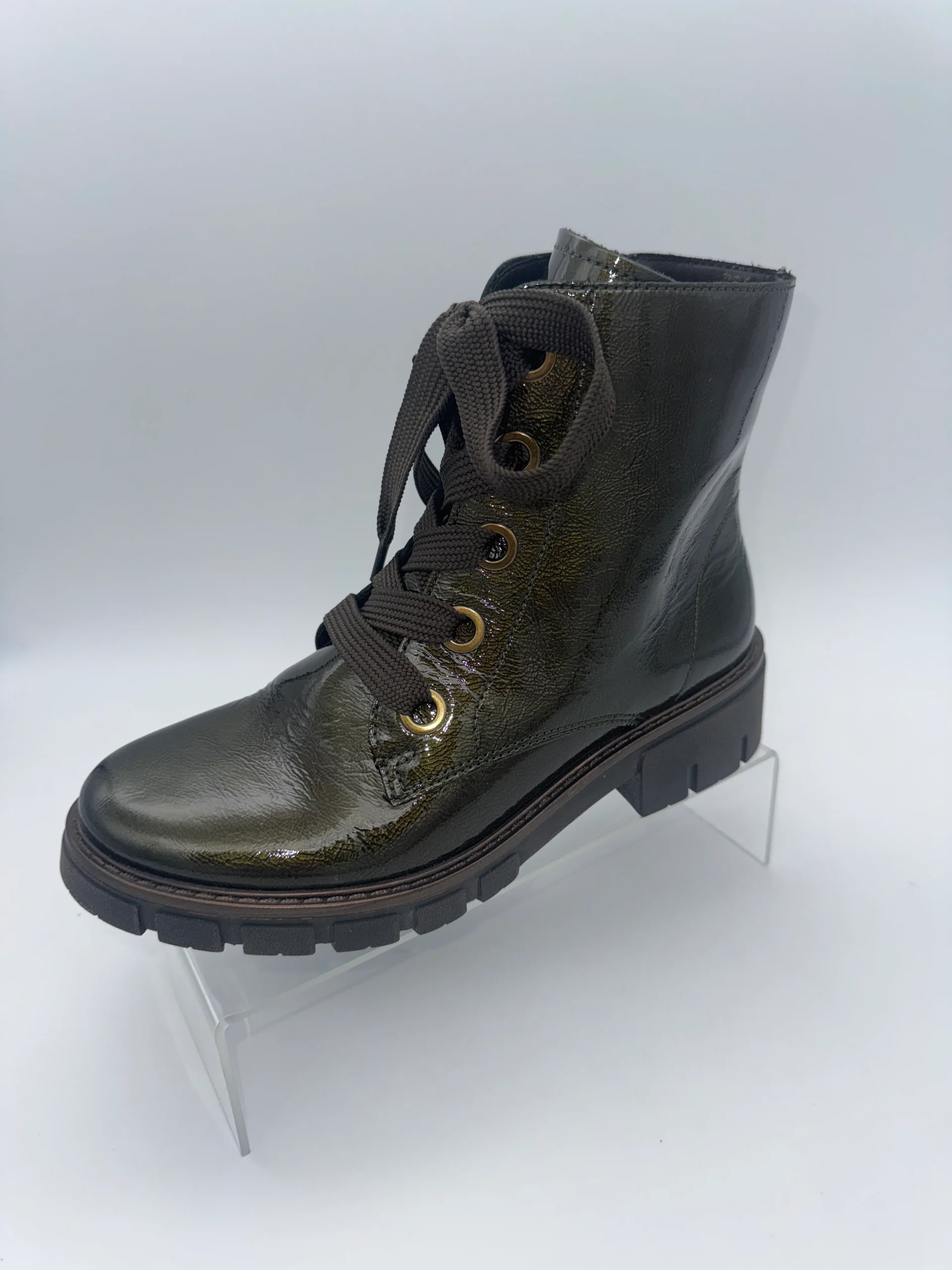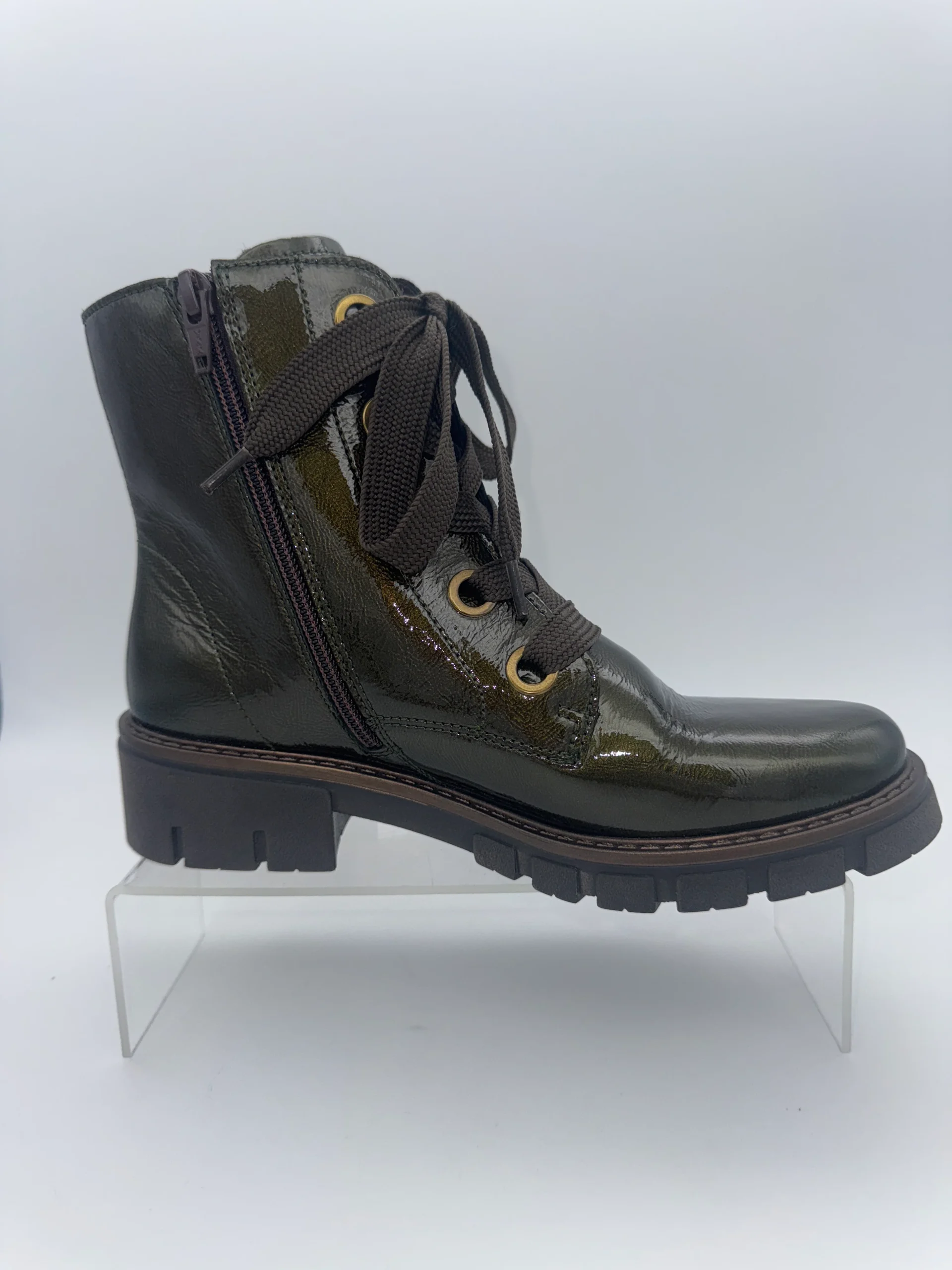 Marque : ARA Modèle : Bottines vernies Saisonnalité : toutes saisons Talon : 3,5 cm Type de chausse : Large Couleur : Vert sapin Matière extérieure : Cuir vernis Matière intérieure : Textile et autre Semelle intérieure : Amovible Semelle extérieure : Autre Fermeture : Zip et lacets