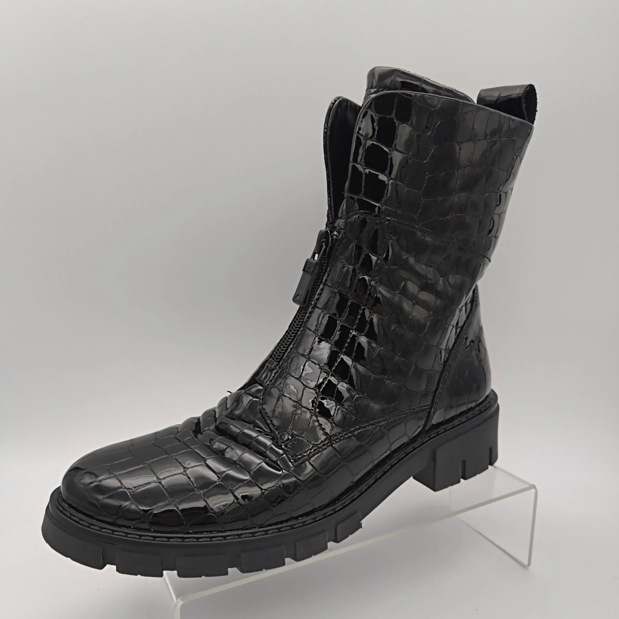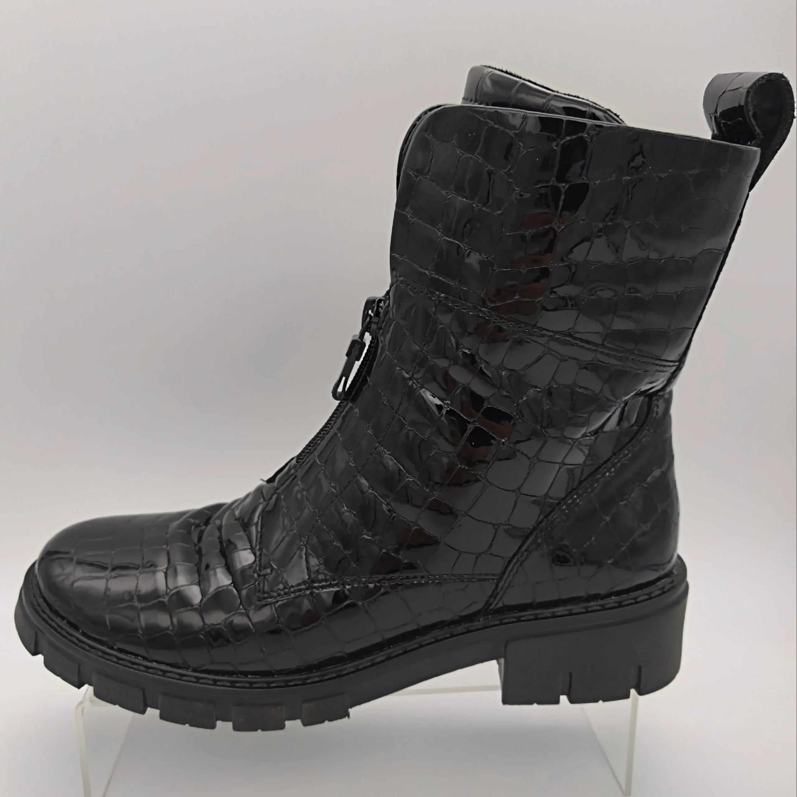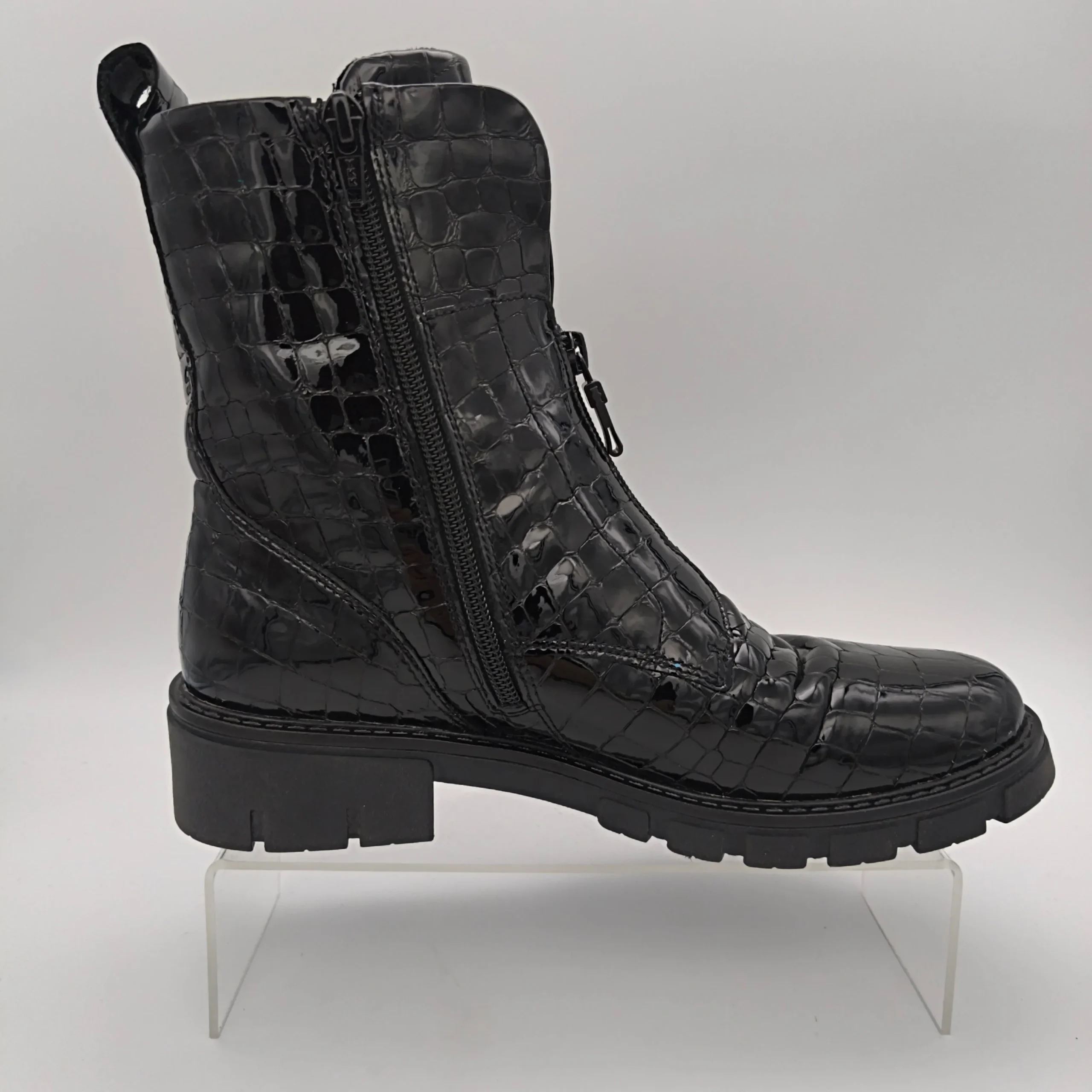 Marque :Ara Modèle : Bottines Saisonnalité : Toutes saisons Talon : 4 cm Type de chausse : Large Couleur : Noir vernis Matière extérieure : Cuir vernis Matière intérieure : Textile Semelle intérieure : amovible Semelle extérieure : autre Fermeture : zip