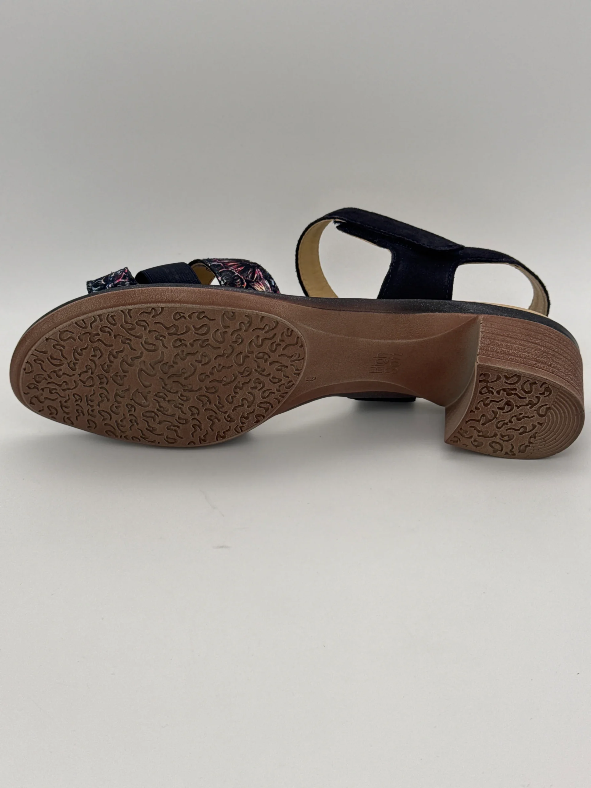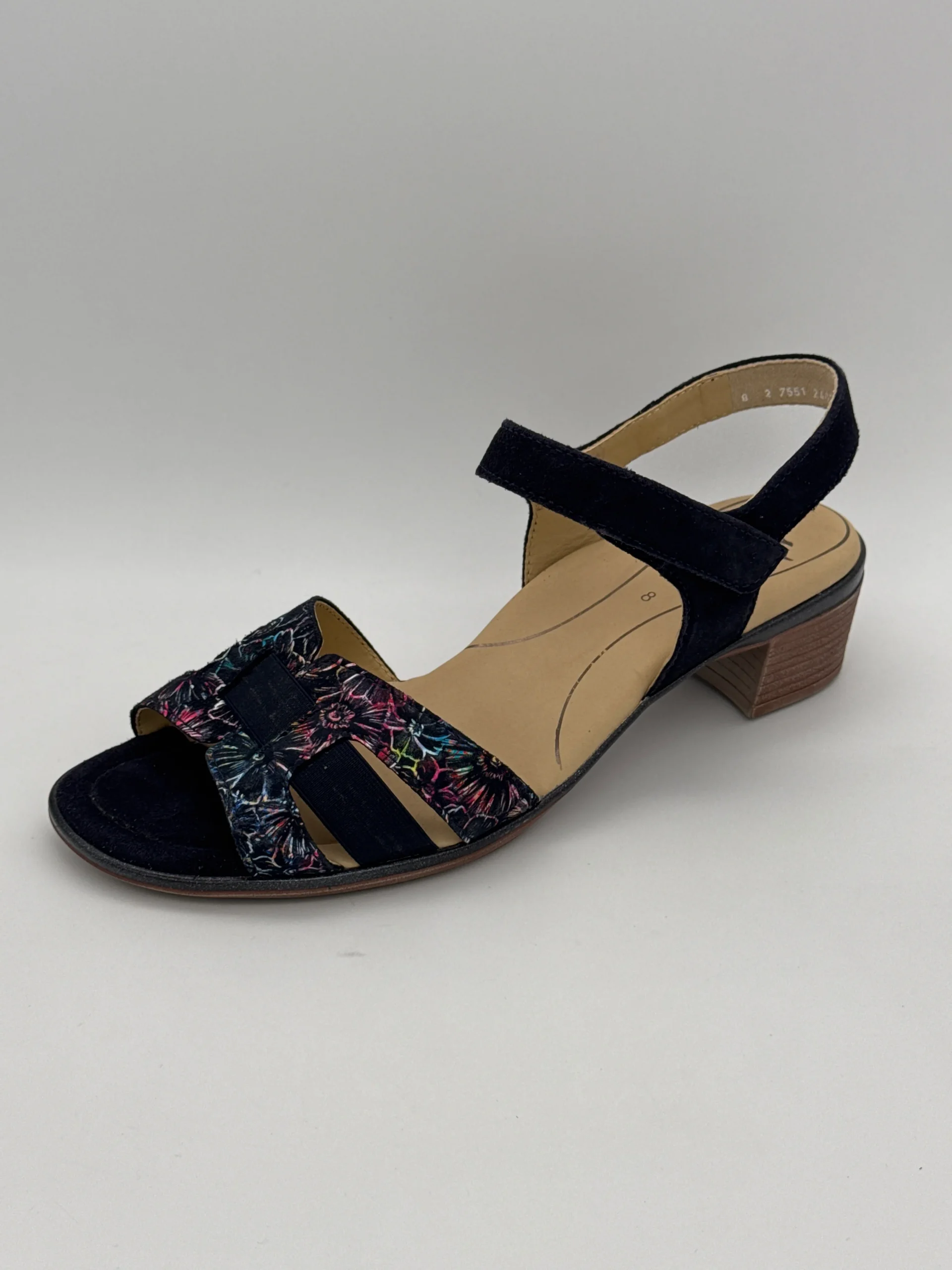 Marque : Ara Modèle : Nu pieds Saisonnalité : été Talon : 4 cm Type de chausse : largeur H Couleur : bleu marine + imprimé Matière extérieure : cuir et autre Matière intérieure : cuir Semelle intérieure : cuir sur mémoire de forme Semelle extérieure : autre Fermeture : Velcro