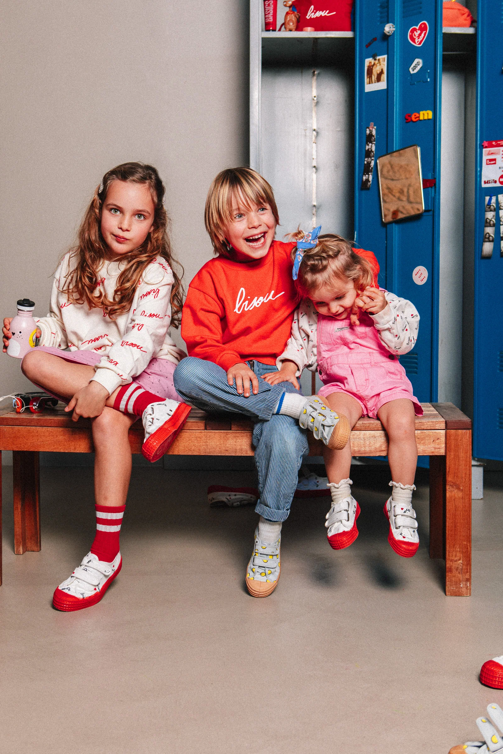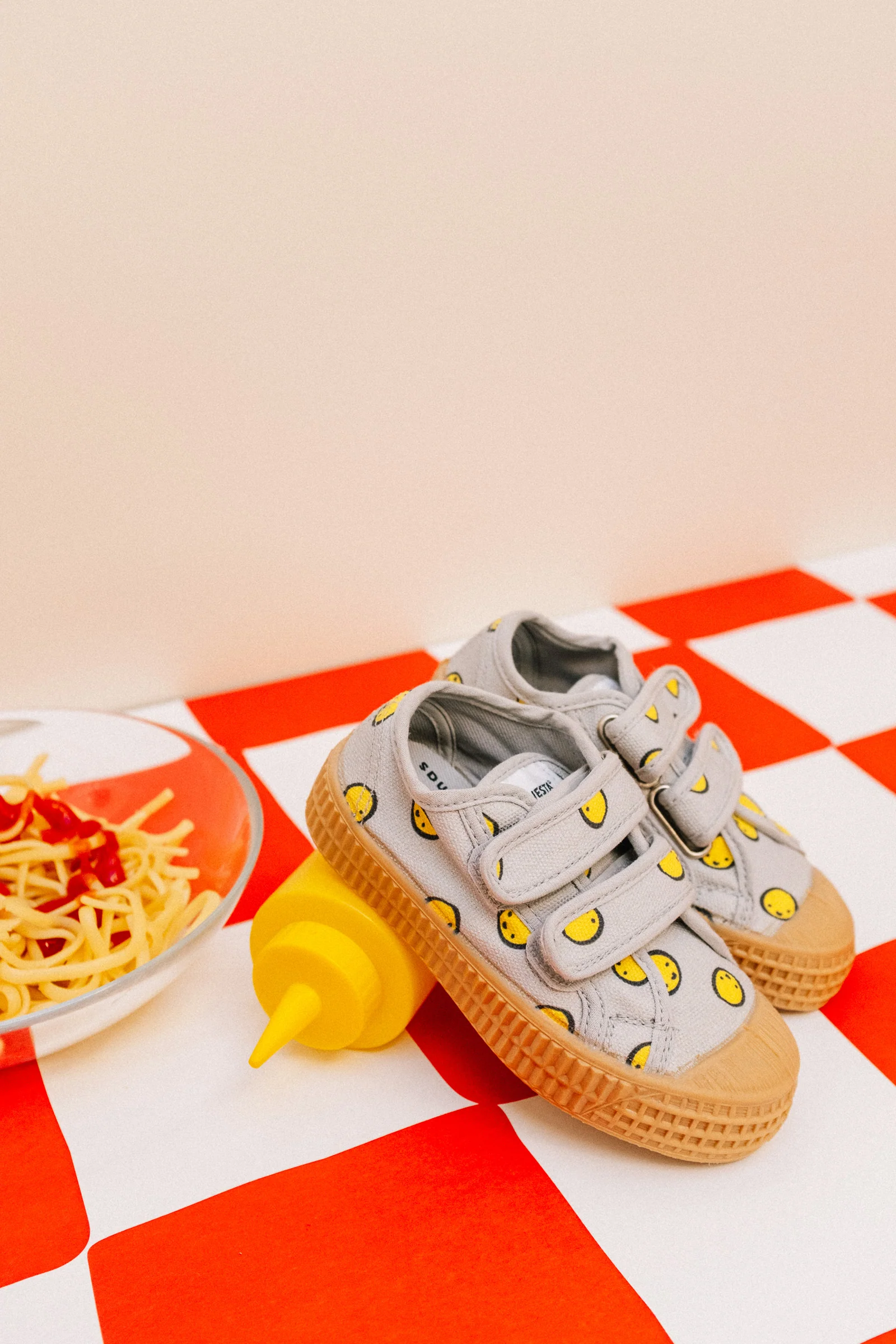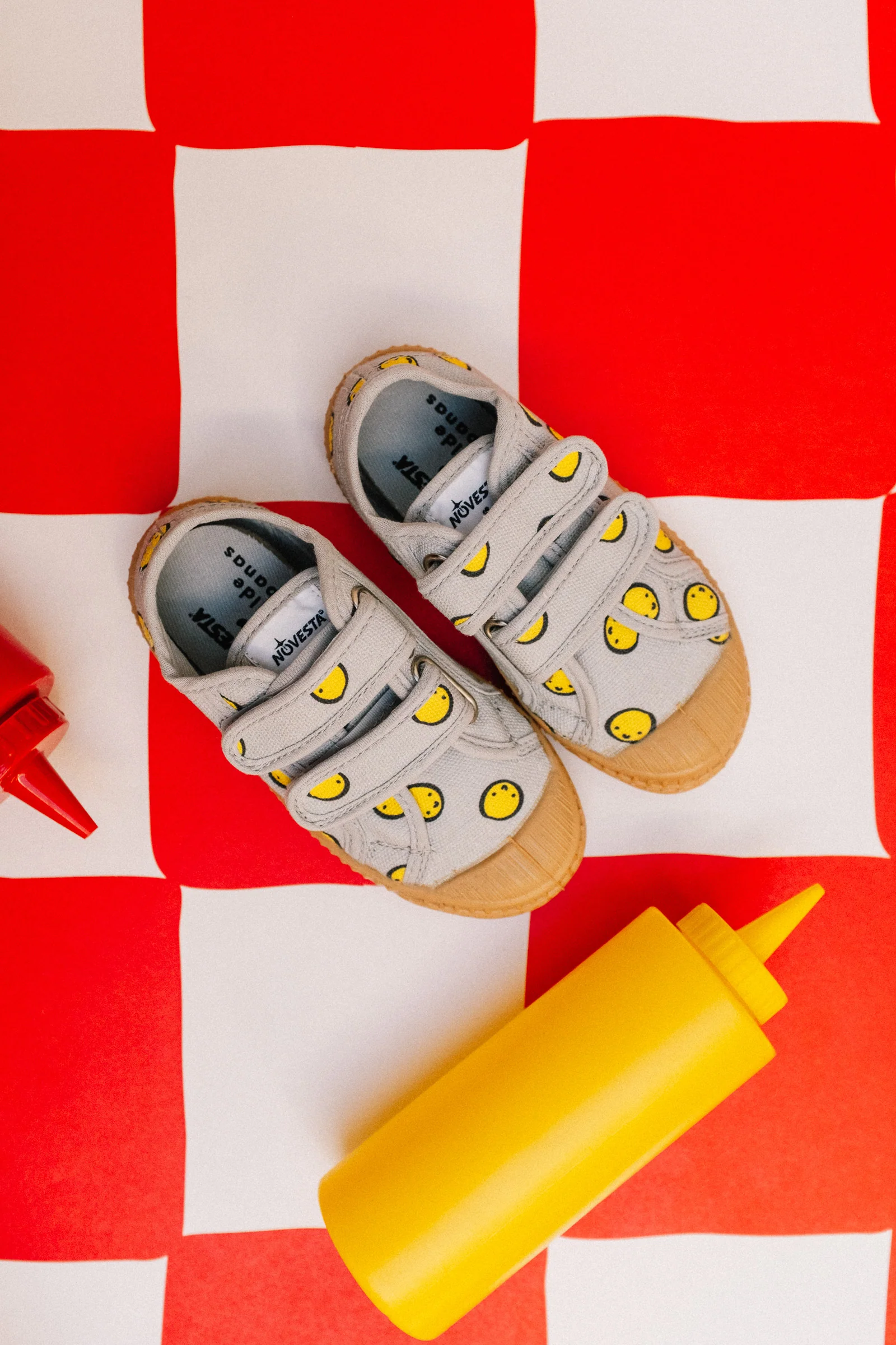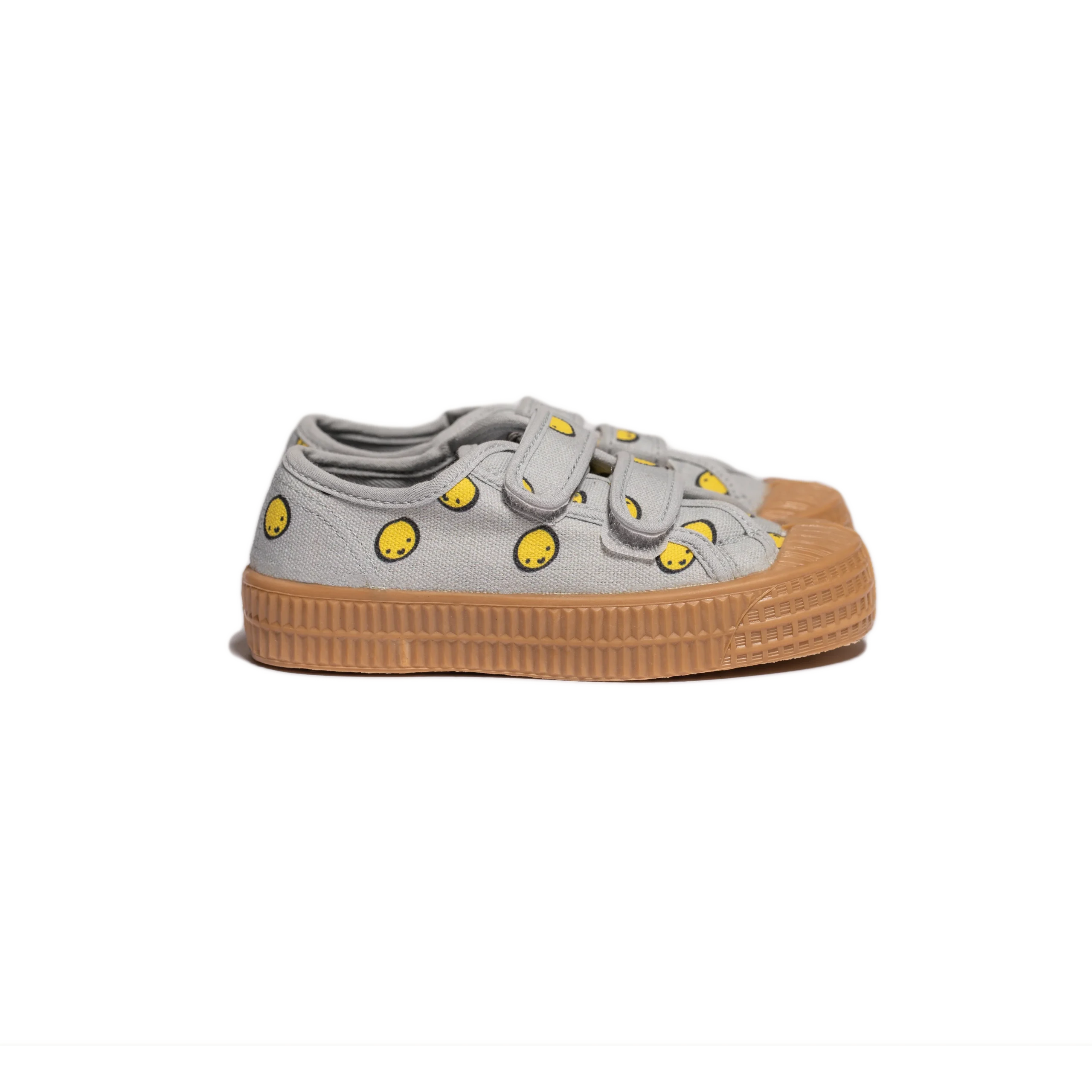 Baskets avec imprimé Smiley, semelle en caoutchouc naturel, scratchs faciles pour les enfants.