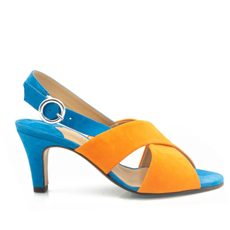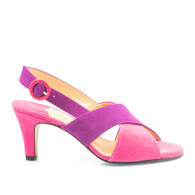 Une sandale à talon bicolore en chèvre velours, joyeuse et confortable. Chèvre velours bicolore. Semelle cuir, talon 5,5 cm