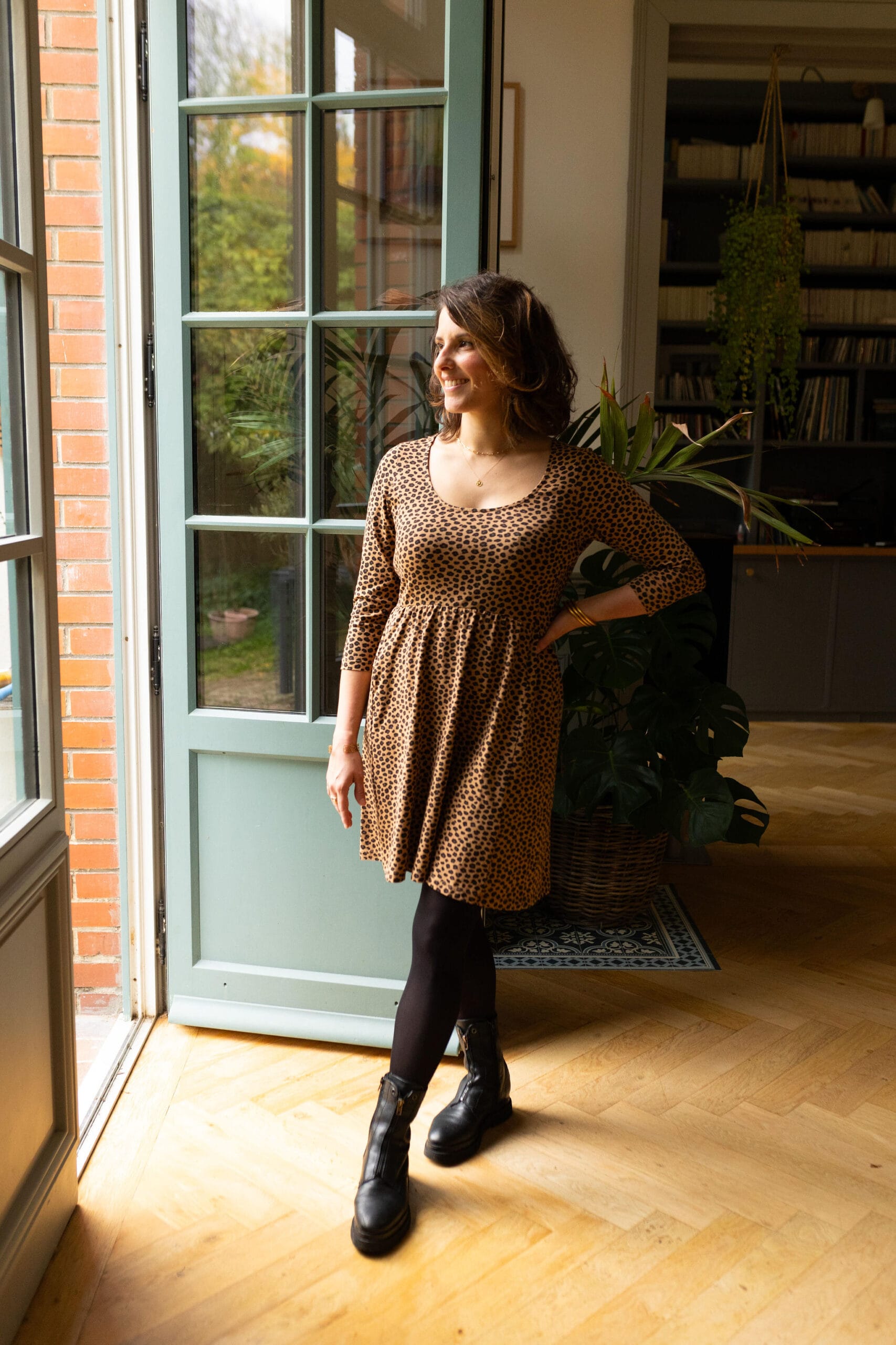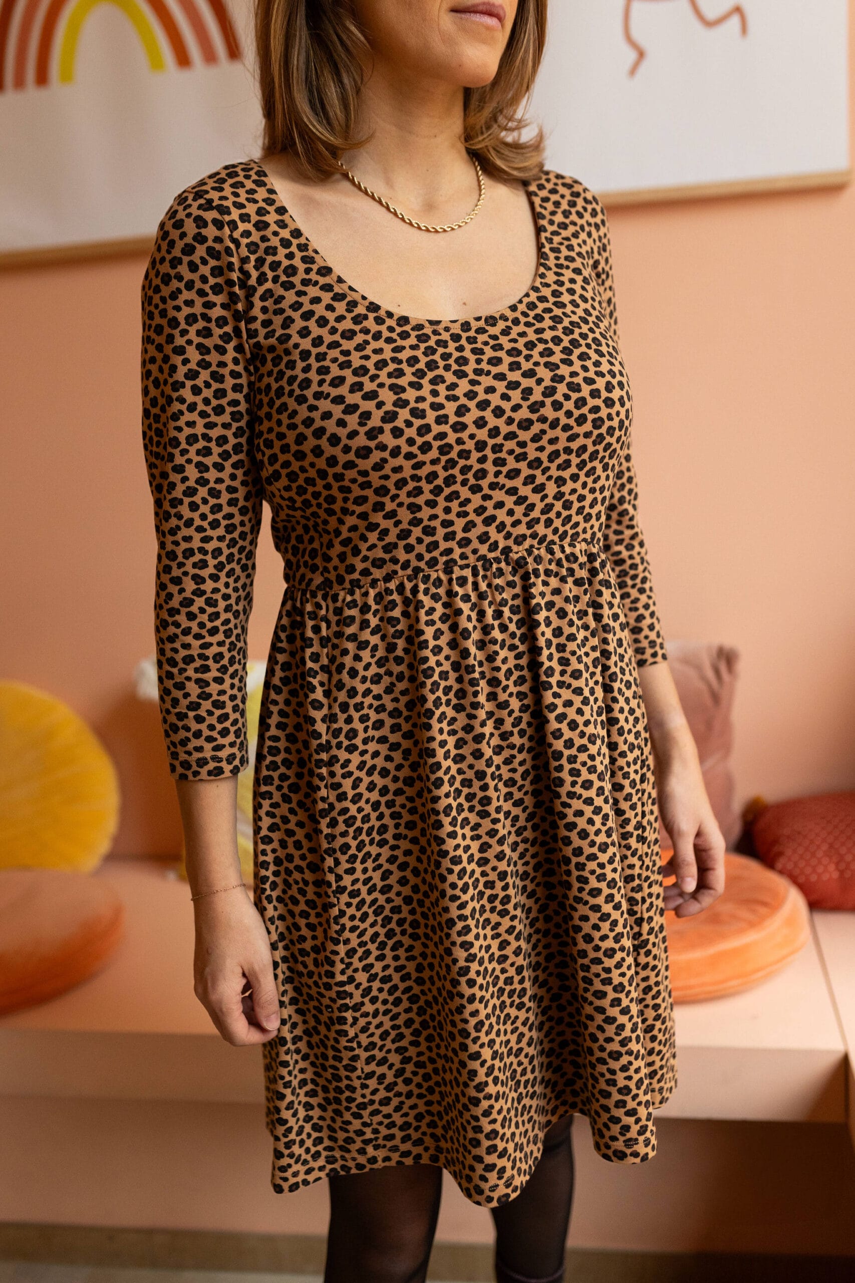 Attention, Born to be Wild ne taille pas très grand référez-vous au guide des tailles en bas de page. Born to be Wild c’est la petite robe d’allaitement qui vous fera craquer cet hiver! Avec son imprimé léopard hyper tendance et sa matière douce et souple légèrement extensible, il n’y aura pas de compromis à faire entre confort et style! Sa coupe cintrée, ses manches ¾ et son joli col danseuse découvrant juste ce qu’il faut, font d’elle une jolie robe hyper féminine à porter sans modération. Comme sur tous nos modèles, ses zips sont invisibles et vous permettront d’allaiter…