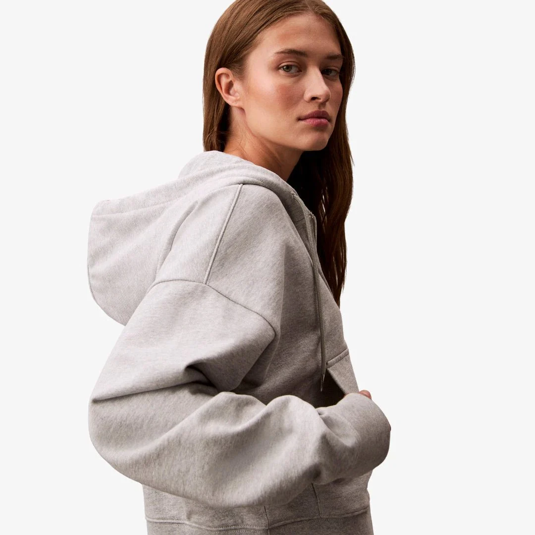 Hoodie femme à coupe droite, fermeture zippée intégrale, capuche réglable avec cordon et poches kangourou. Logo discret « CK » brodé sur la poitrine. Style urbain et confortable pour un usage quotidien.