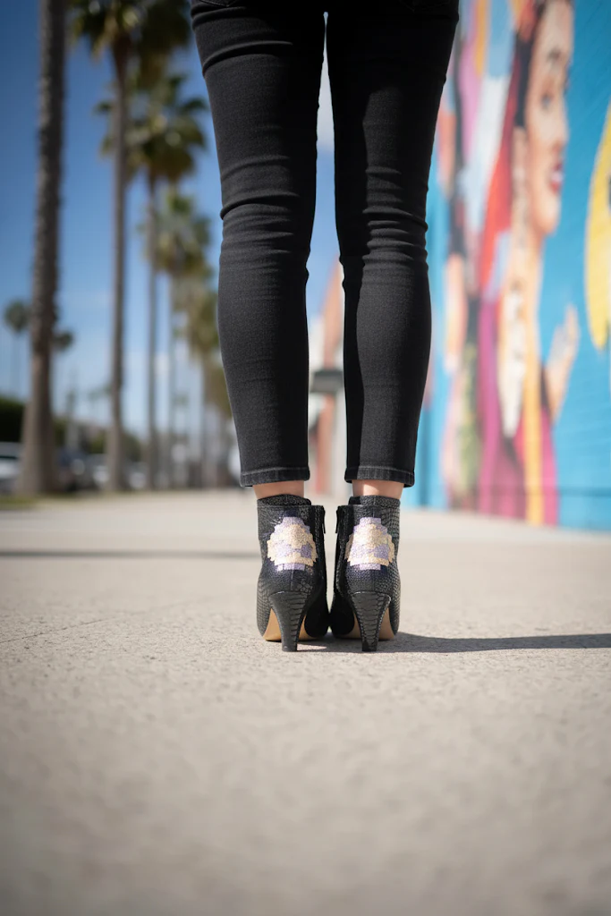 • Nubuck imprimé métallisé noir, Détails Glitter champagne et acier