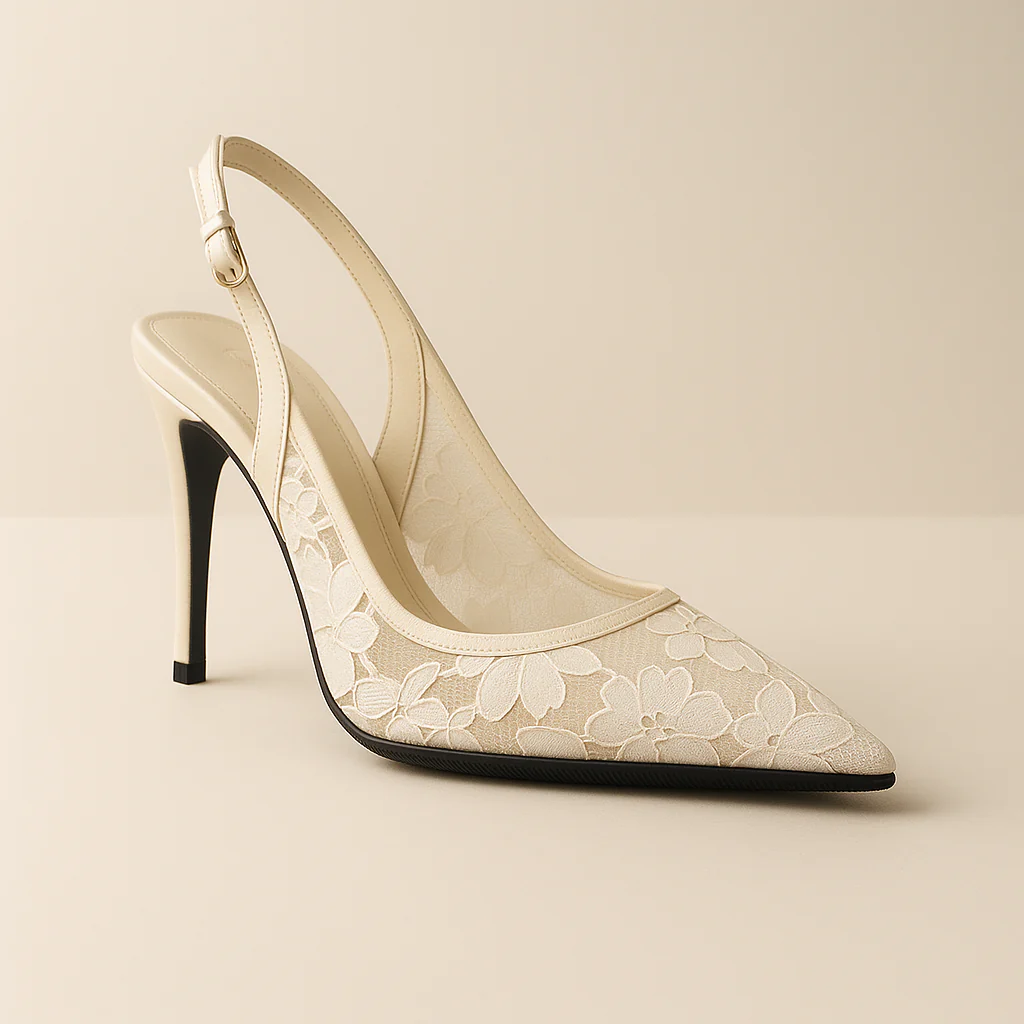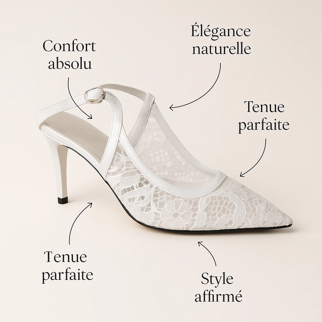 En croisant vos jambes à la terrasse d’un café, l’escarpin capte la lumière du jour tandis que sa dentelle blanche dévoile subtilement votre peau. Une élégance aérienne.