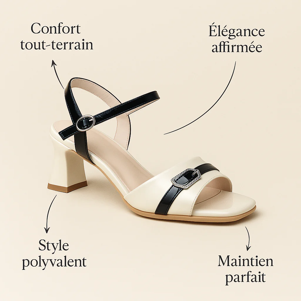 La texture lisse du cuir vegan, reliée par une bride chevillée subtilement structurée, assure un maintien tout en finesse.
