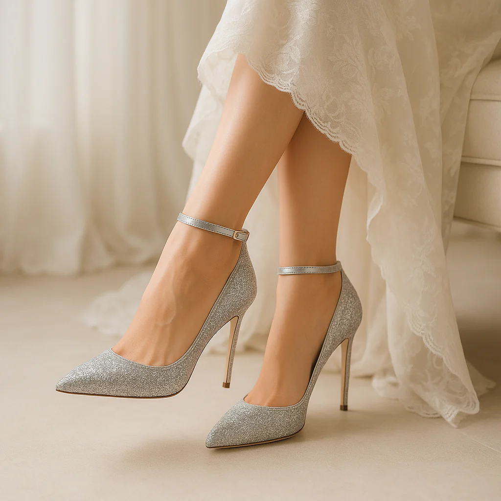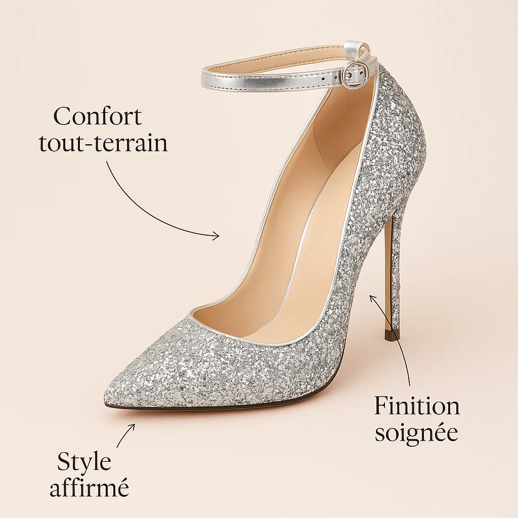 Le tissu sequiné capte la lumière à chaque mouvement. La cambrure affûtée épouse le pied avec délicatesse, révélant une démarche fière et aérienne.