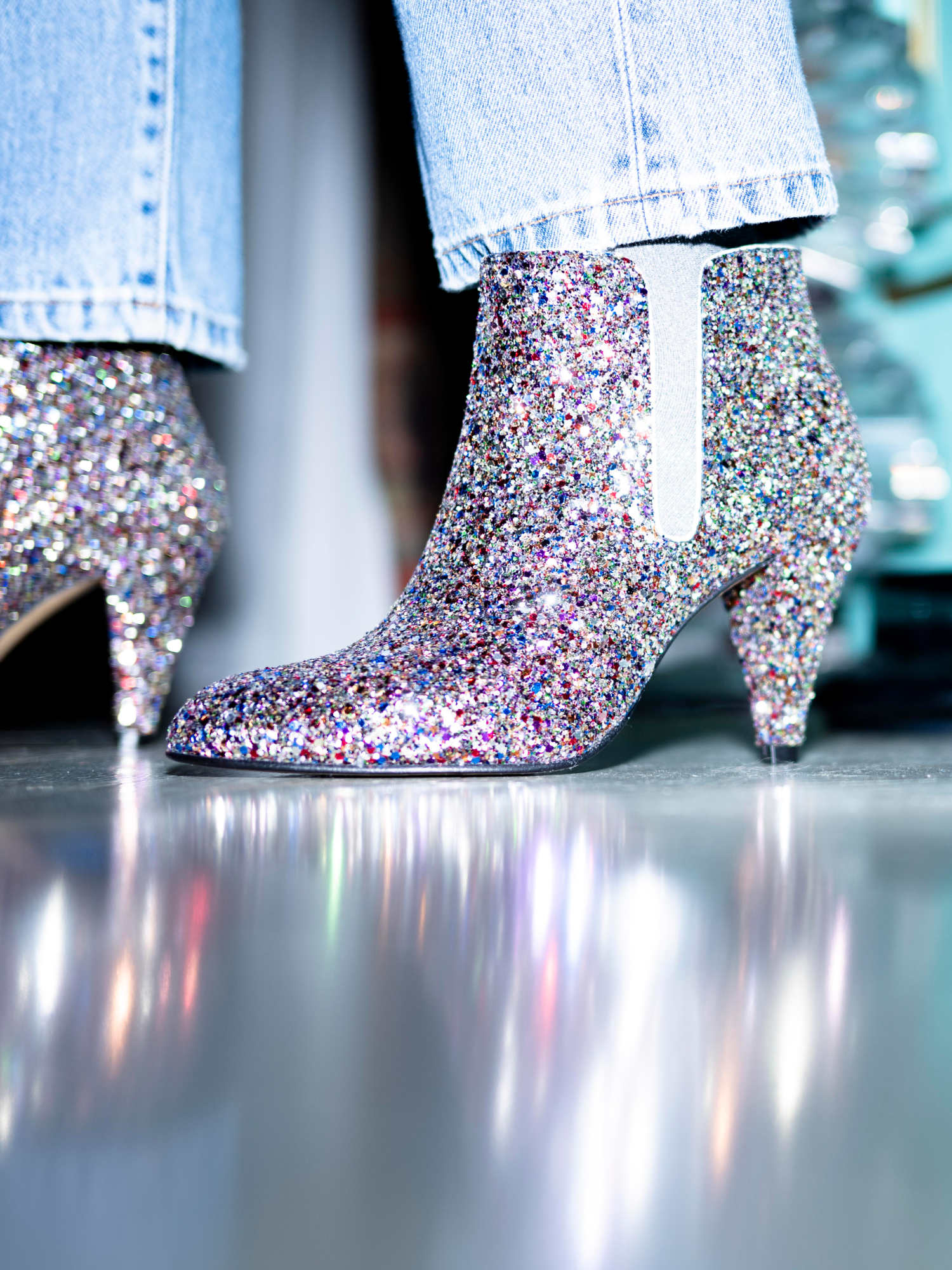 • Hauteur de Talon : 7 cm• Glitter Multicolore, Détails nubuck métallisé acier• Semelle intérieure et extérieure Cuir• Fabrication : Espagne• La Fifty-Five chausse à la pointure