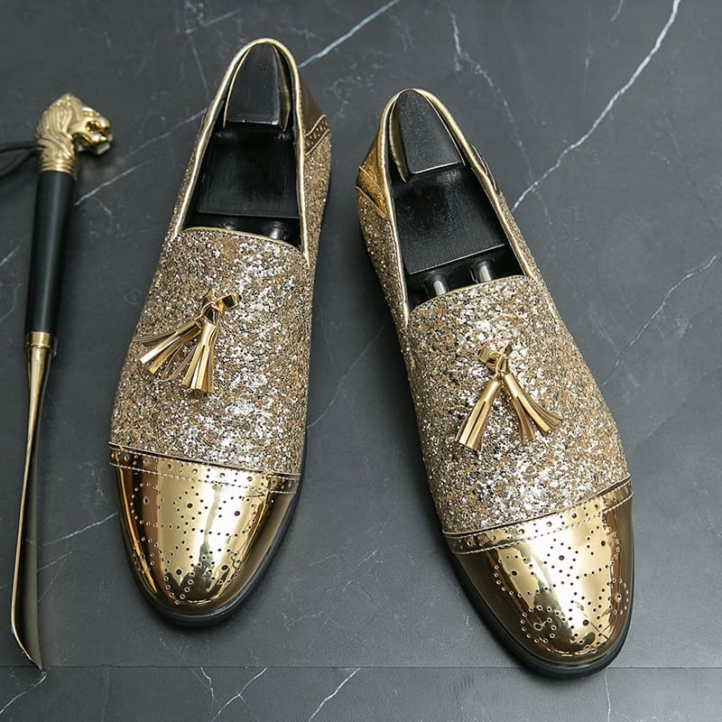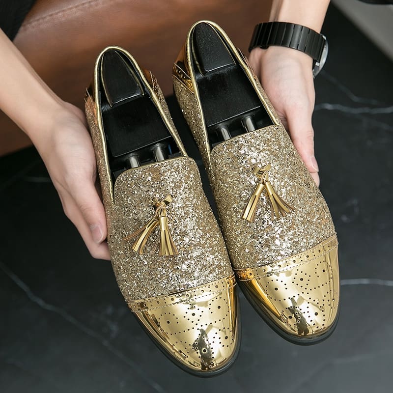 Nos mmocassins dorés pour soirées avec vernis et paillettes enchanteront tous les hommes cherchant des chaussures de soirée uniques et raffinées. Avec leur allure chic et distinguée, ce modèle brillant apporte un éclat glamour à votre look. Choisissez-les pour éblouir lors d’une fête, d’un mariage ou de toute occasion spéciale. Ne tardez plus et procurez-vous cette paire qui fera de vous l’étoile de la soirée !