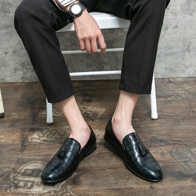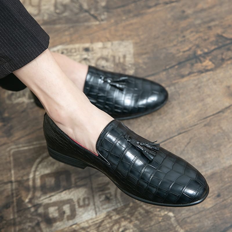 Ces mocassins en cuir verni noir à effet crocodile représentent l’apogée du luxe et du raffinement. Conçues pour offrir un confort inégalé et un style passe-partout, ces chaussures séduisent par leur cuir verni noir éclatant et une texture délicate de peau de crocodile, conférant une note distinctive. Adaptés à des événements formels ou décontractés, ces mocassins constituent un ajout polyvalent à votre collection.