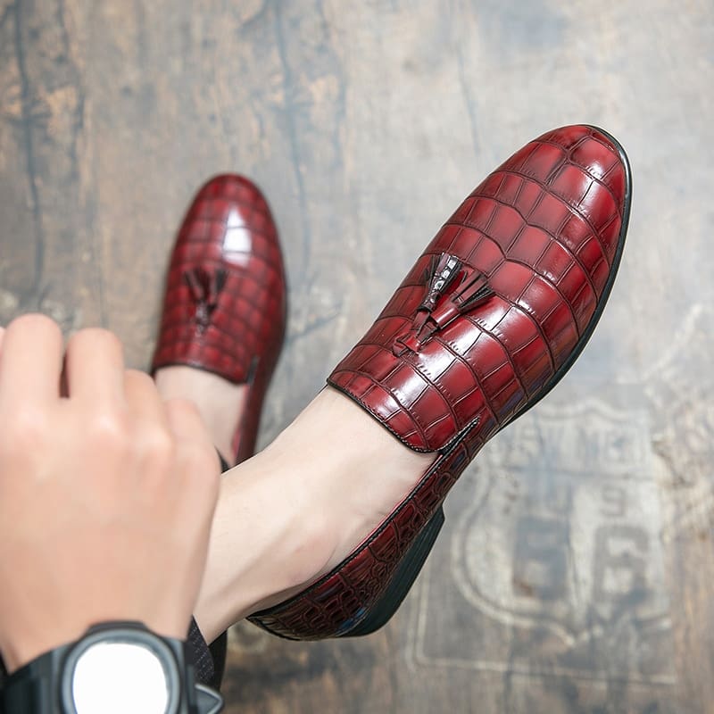 Ces mocassins rouges en cuir laqué sont parfaits pour ceux qui recherchent un look sophistiqué. Leur aspect peau de crocodile apporte une originalité sans pareille à ces chaussures. Avec leur semelle confortable, ils garantissent un port agréable toute la journée. Idéal pour une occasion spéciale ou pour sublimer votre tenue de tous les jours !