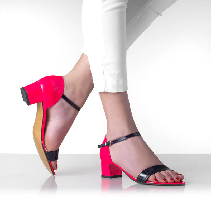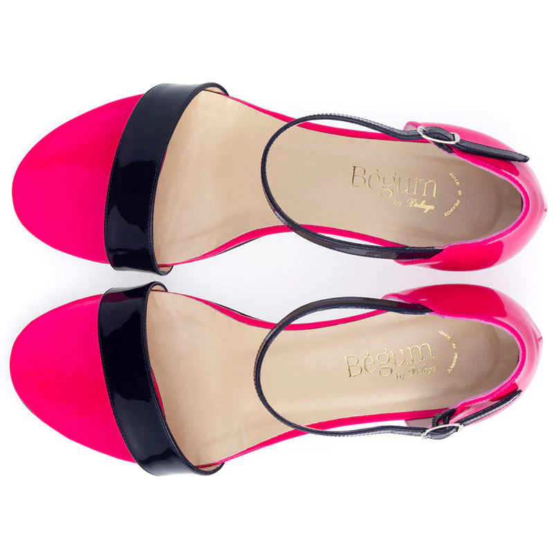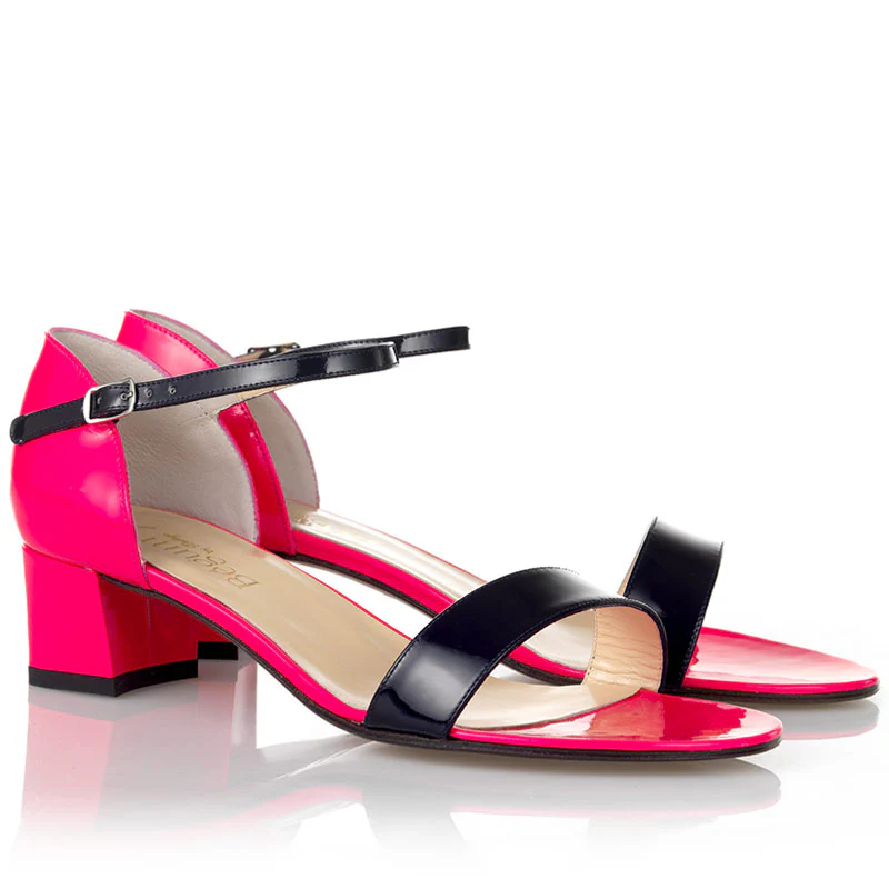 Une élégante sandale bicolore à petit talon, parfaite pour parader en ville avec ses coloris pop !Cuir verni, semelle cuir et talon recouvert.Talon : 4 cm.
