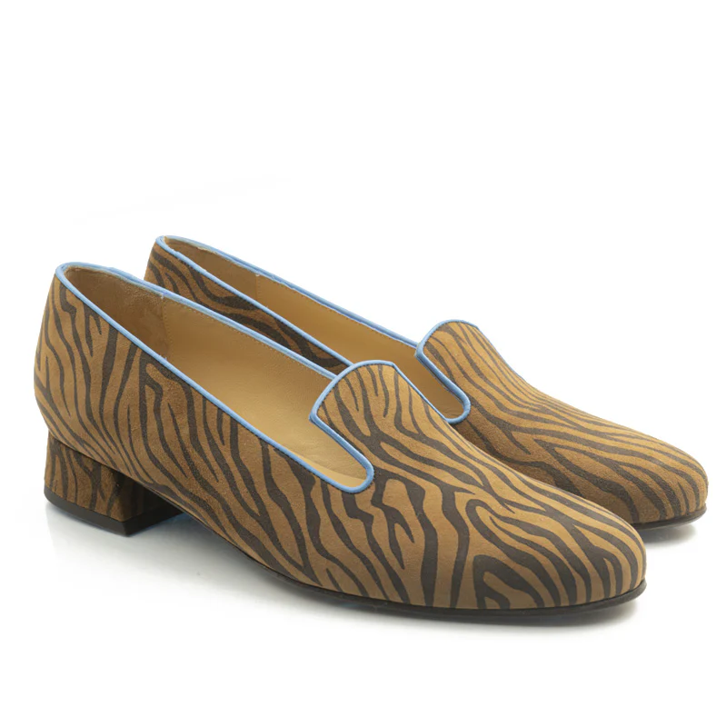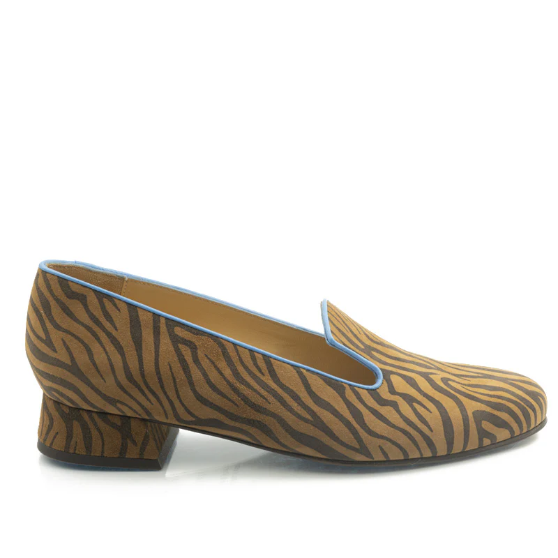 Comme une pantoufle, ce soulier deviendra vite un classique de votre garde-robe avec son cuir imprimé zèbre qui se marie avec tout. Cuir imprimé, souligné d’une bordure en agneau bleu. Semelle cuir. Talon 2 cm.