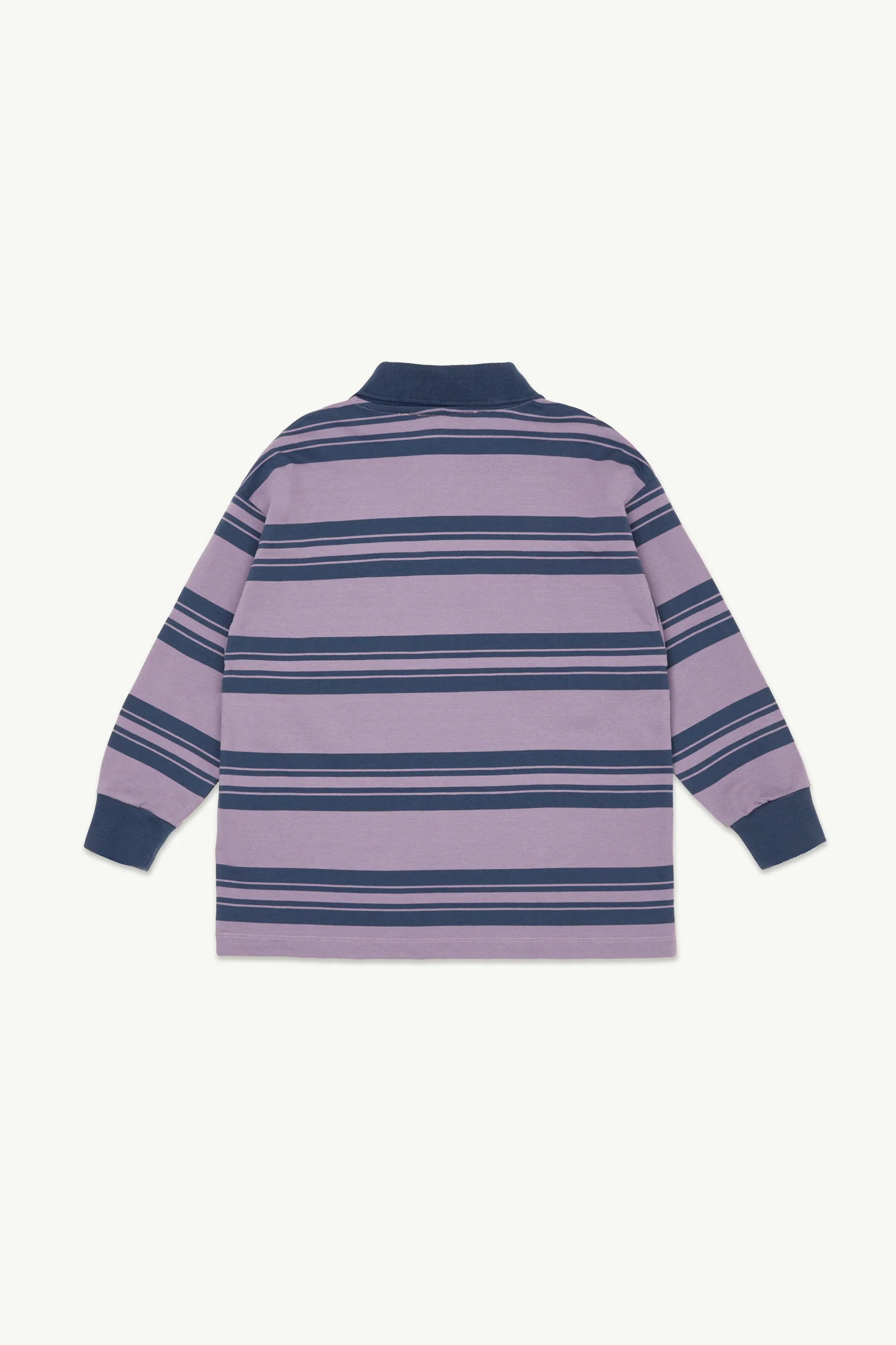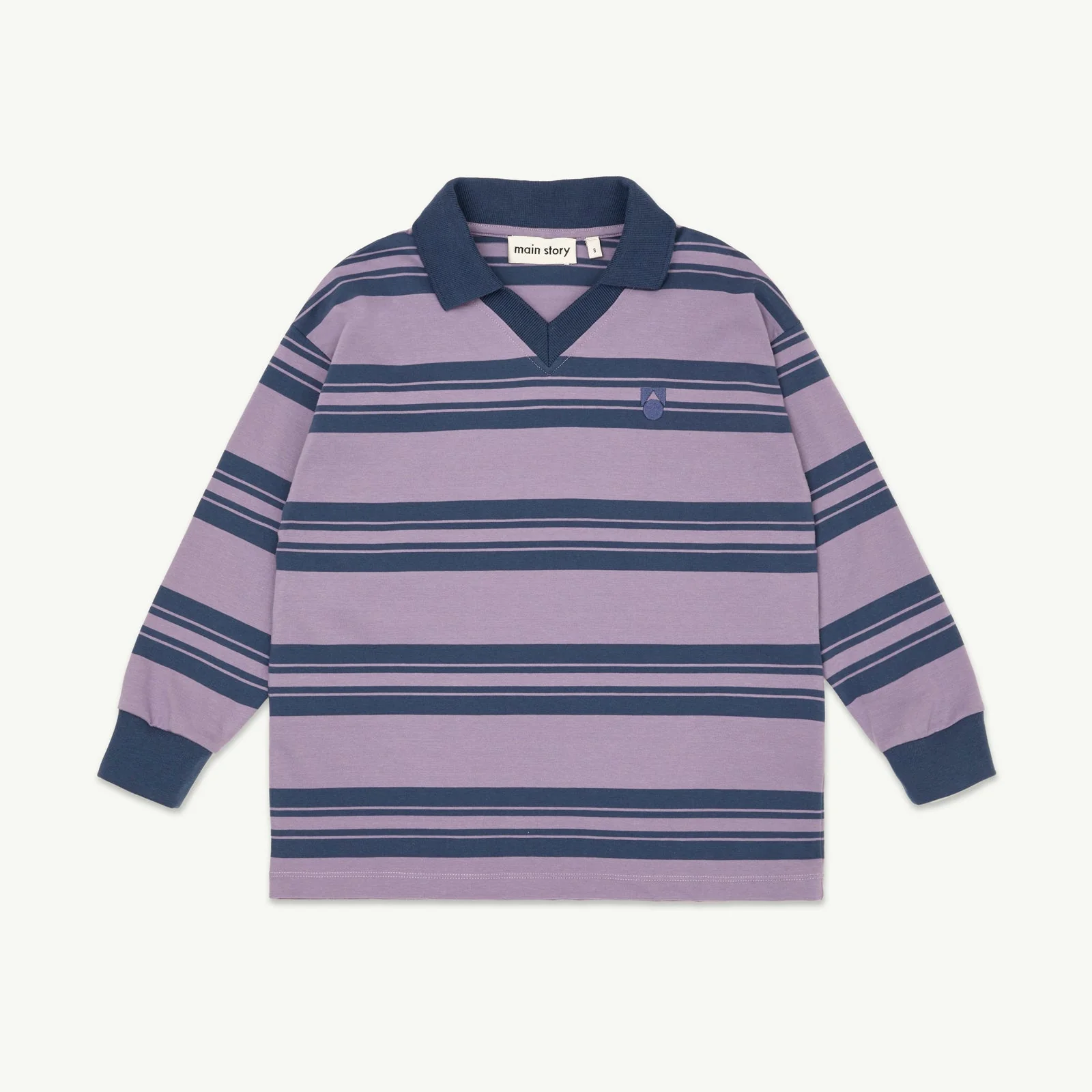 Inspiré du polo classique, il revisite ce grand basique avec des rayures élégantes dans des tons mauve et bleu marine. Sa coupe ample et ses manches longues en font un essentiel confortable et stylé pour un look casual et affirmé.