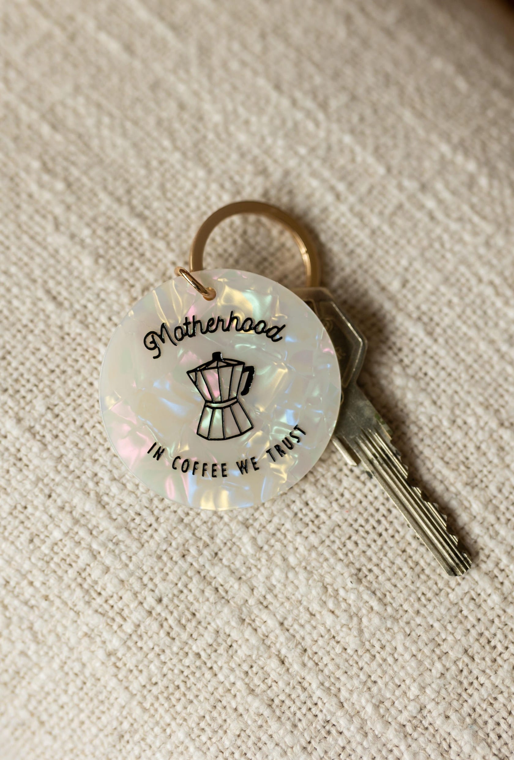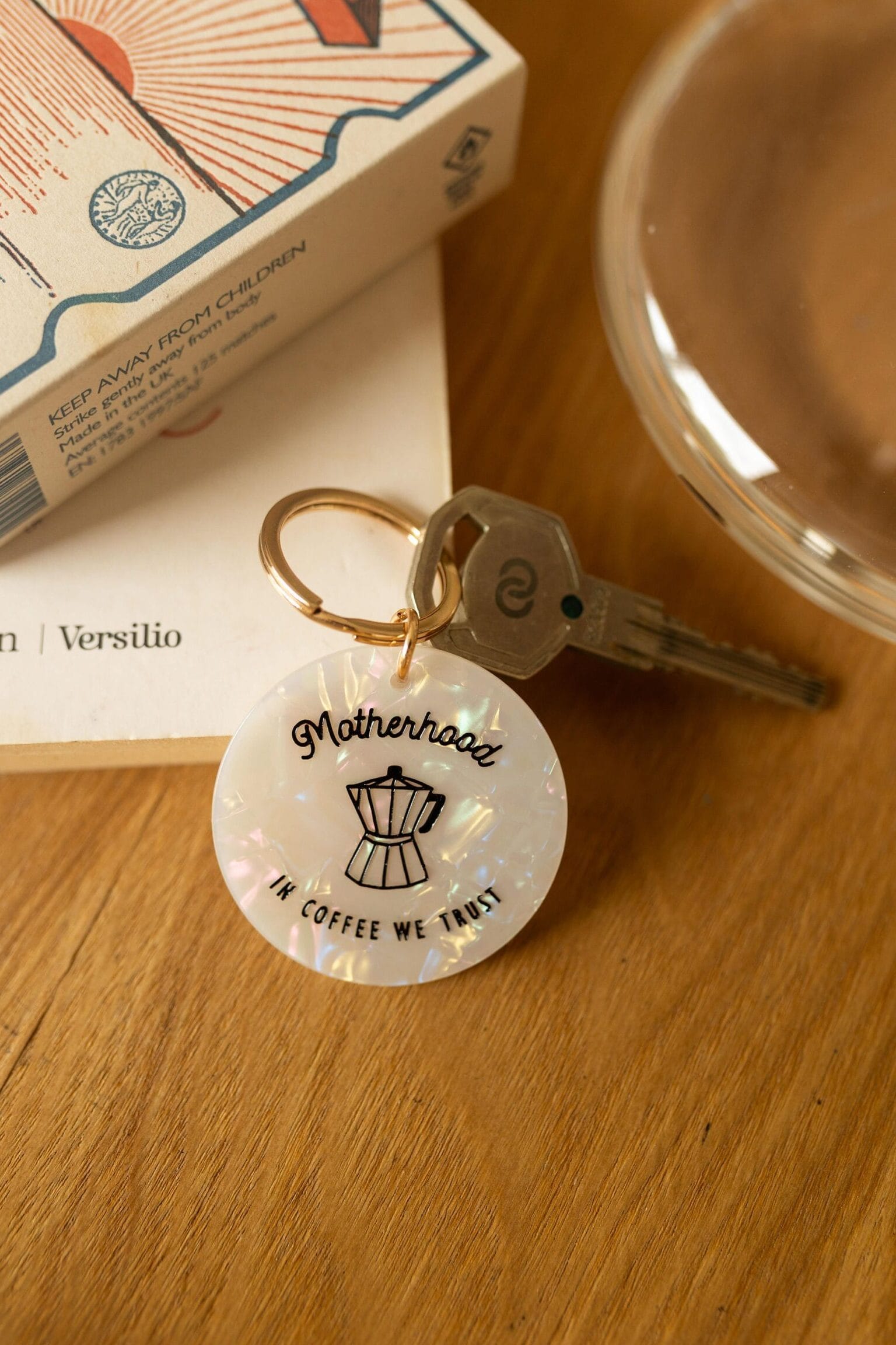 Ce porte-clés, c’est un peu le cri du cœur de toutes les mamans en mode survie. Une petite dose de vérité accrochée à vos clés : entre trois tétées et deux couches explosives, quand le réveil sonne et que vous avez dormi 3h par tranches de 20min, il vous rappelle que le café reste votre allié le plus fidèle pour tenir avec les nuits courtes et les journées à rallonge! (avec modération of course!) L’inscription « Motherhood, in coffee we trust » dit tout. Pas besoin d’en faire des caisses : si vous savez, vous savez! Solide, léger, et facile à retrouver…