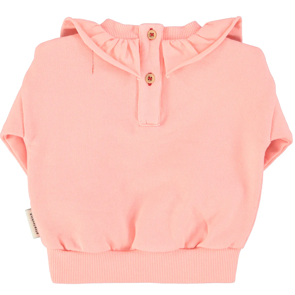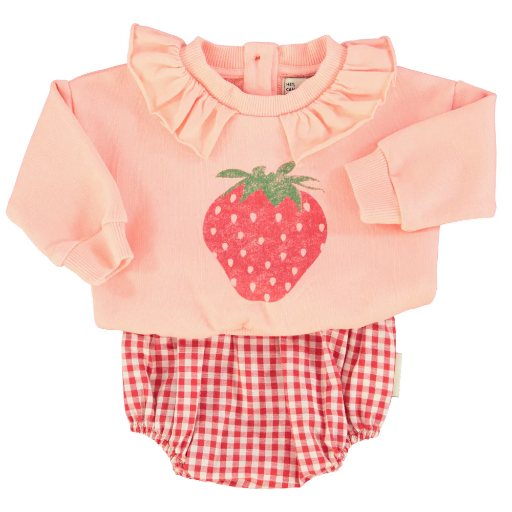 🍓 Offrez à votre tout-petit un nuage de tendresse avec ce sweatshirt bébé en coton biologique, chaud, moelleux et pensé pour ses premières aventures. Son col rond à volants ajoute une touche délicate et féminine, tandis que l’imprimé fraises sur le devant apporte une note ludique et gourmande, fidèle à l’univers PIUPIUCHICK.