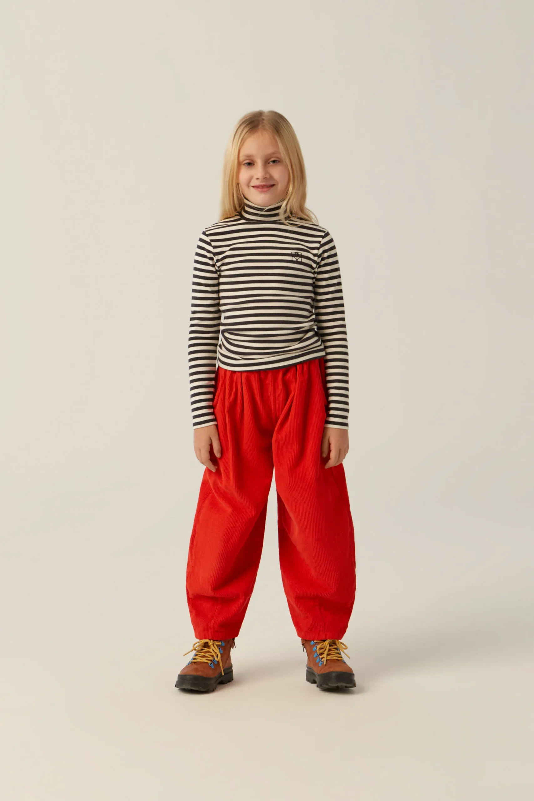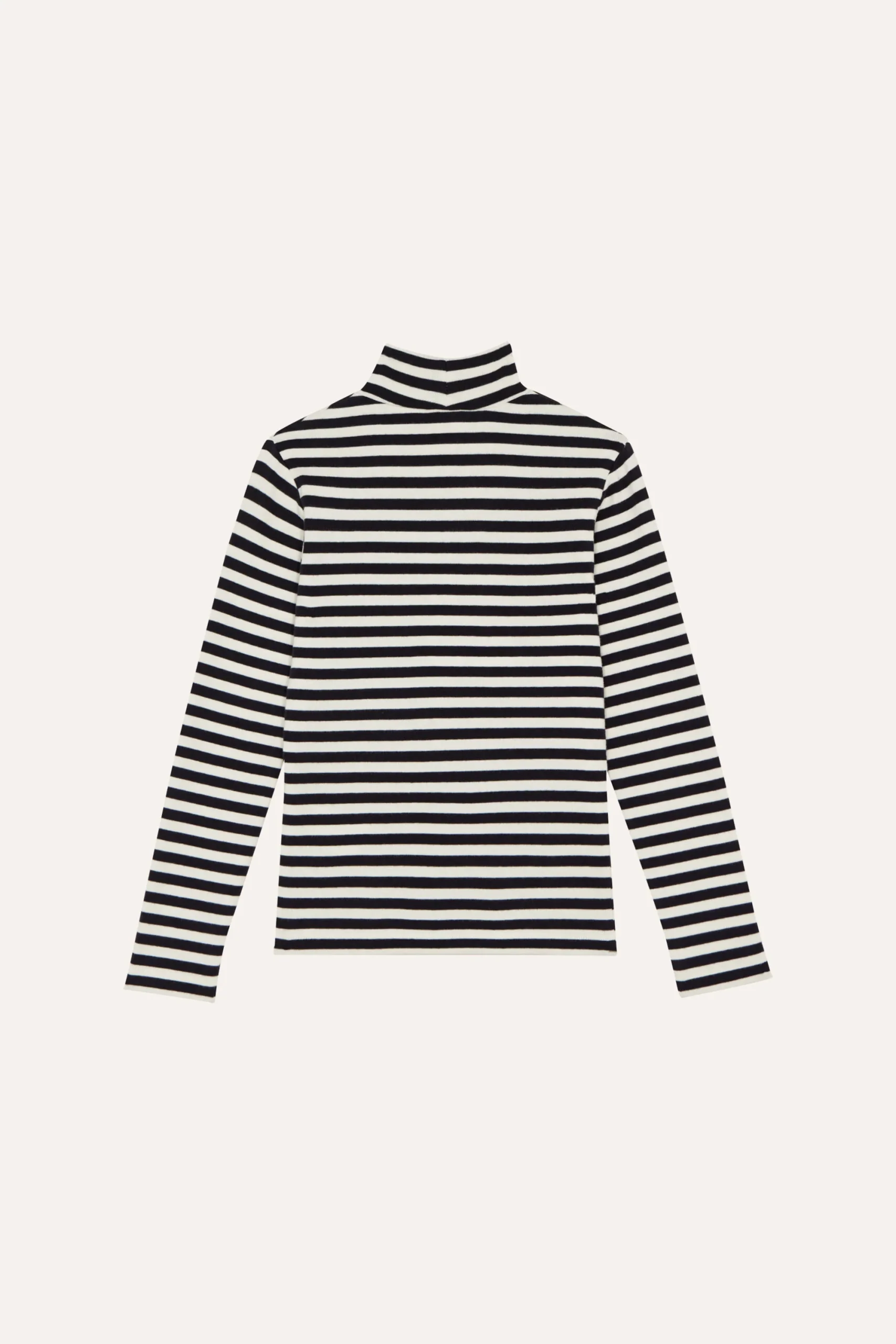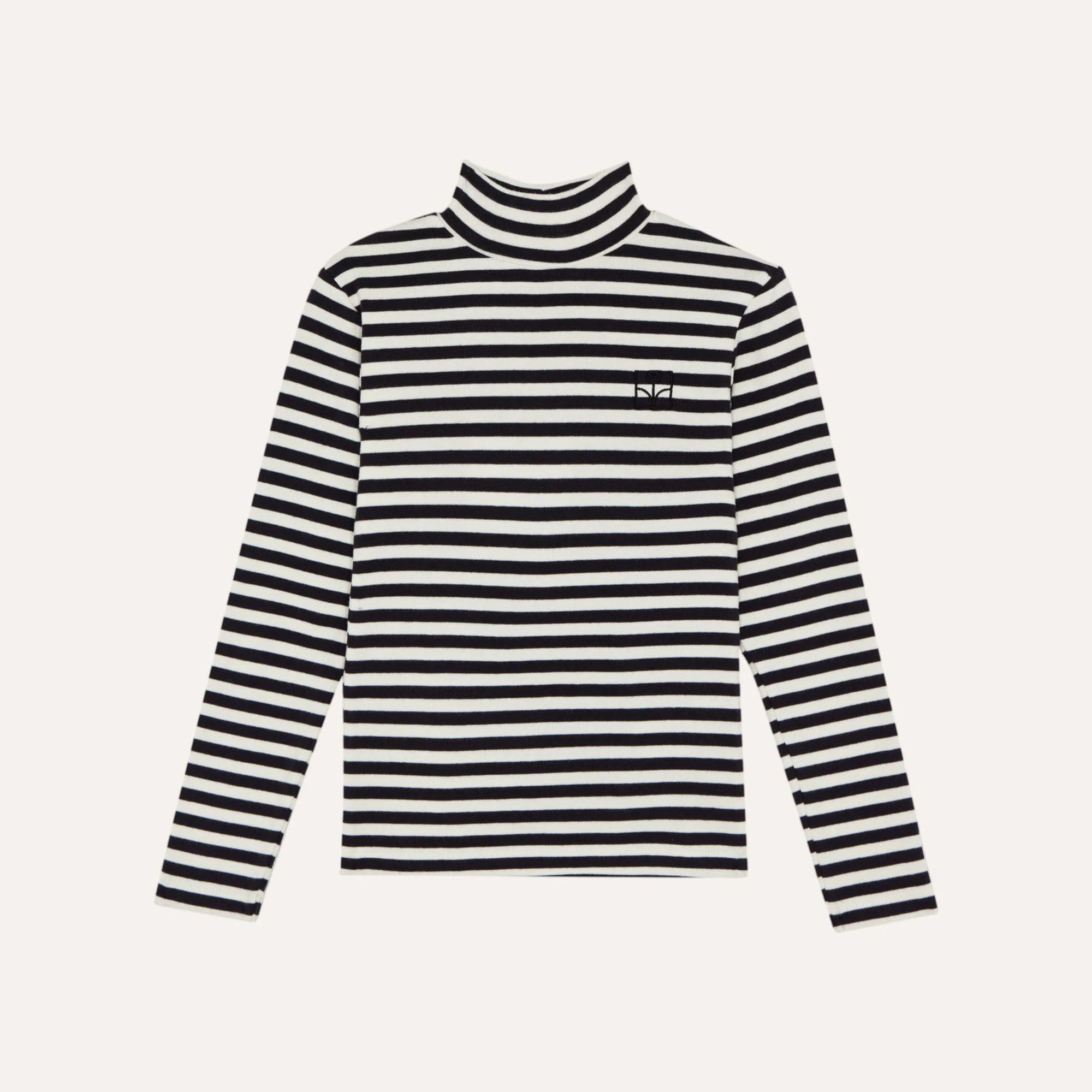 Le t-shirt à col roulé rayé gris est une pièce intemporelle. Conçu au Portugal dans un coton doux et confortable, il présente une coupe ajustée, des manches longues et un col montant pour bien couvrir le cou. Idéal à porter seul ou sous un pull pour affronter le froid avec style.